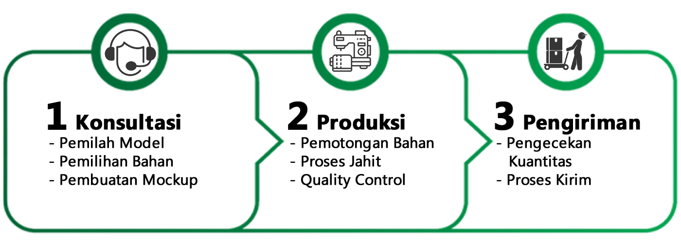 Berkomitmen untuk memberikan hasil produksi sesuai pesanan dalam kualitas juga ketepatan waktu produksi. Memiliki tim ahli di bidangnya, tim teknis seperti tim potong, jahit, QC yang sudah dikurasi diberikan pelatihan.